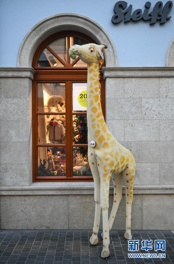 这是11月25日在德国法兰克福一家儿童服装店前拍摄的戴口罩的长颈鹿玩偶。新华社记者逯阳摄