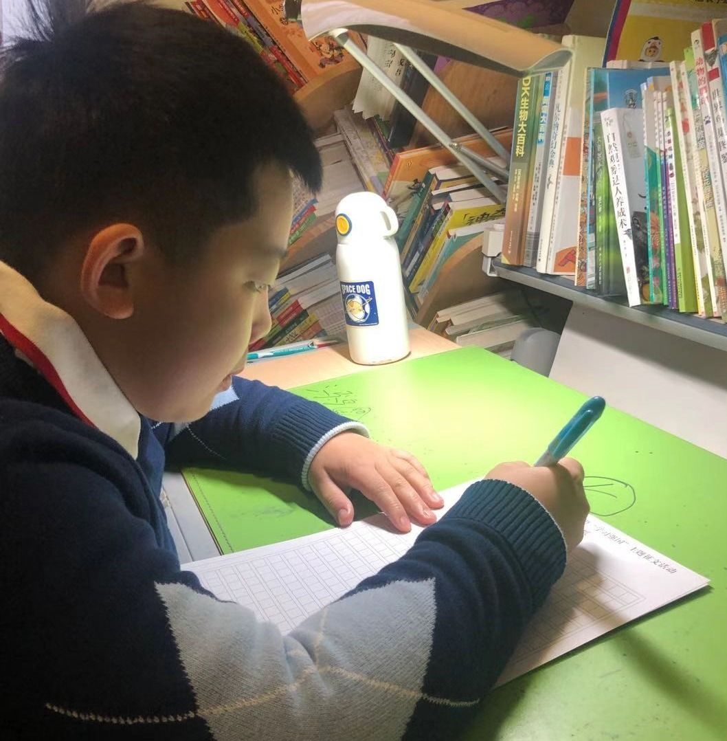 武汉外国语小学四(3)中队语文小助理张云皓正在构思。