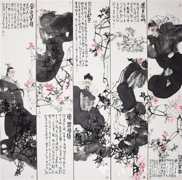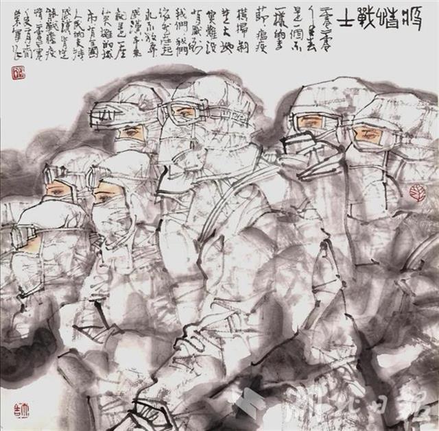 参展艺术家叶军,是湖北美术学院教授、国画系主任。此次展览展出了他两个主题的创作,一是高士、仕女人物画;二是关于疫情的主题创作。叶军说,我是主足于传统,以诗书画印结合的表现方式介入传统国画,并和当代的社会、艺术进行连接。其中,一幅名为《荆楚遗韵》作品特别引人注目。“我将曾在楚地生活过的名士,包括屈原、宋玉、孟浩然、米芾融于同一画面中。”叶军说:“这样创作的意图,一方面是表现楚国的包容,另一方面,也是从传统的高士形象,表达自我追求的一种状态。”在疫情期间,叶军用多幅写意人物作品“记录”身边人的表情,其中最有代表性的是《疫2020 记录武汉人之表情》,原作是一幅2米*2米的大画,已被中国美术馆收藏,他用高仿的方法,画了一幅小画参展。画面中,他记录了美院身边人的抗疫身影,有刘寿祥、徐勇民、刘一原等教授,也有医务人员。鲁虹认为,叶军的画面造型写实中有夸张,具有方硬坚实的特点;其画面笔墨是从传统篆书中转换而来,显得刚劲而有力;其画面构图无疑汲取了摄影中大特写方式,故来得非常强烈动人。