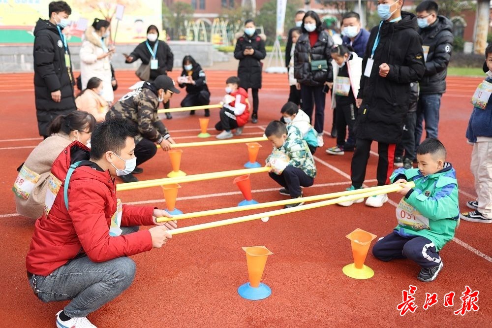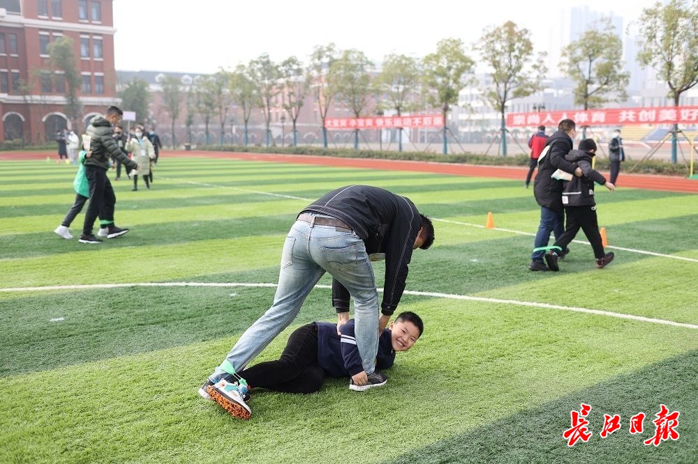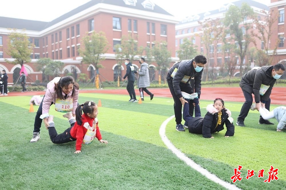 “家长请不要把孩子的脚抬得太高,这样孩子爬起来会很吃力。”在“推小猪”比赛现场,裁判不停提醒性急的爸爸们。这项比赛中,家长抓住孩子的脚踝并抬起来,孩子必须依靠手臂的力量爬到终点。在“两人三足”项目中,不时出现人仰马翻的景象,孩子笑着爬起来继续比赛。亲子运动会设置了“小脚与大脚”“两人三足”“能量传递”“艰难前行”等趣味十足的项目,家长和孩子必须协力同心才能获胜,呐喊声、欢笑声响彻整个操场。