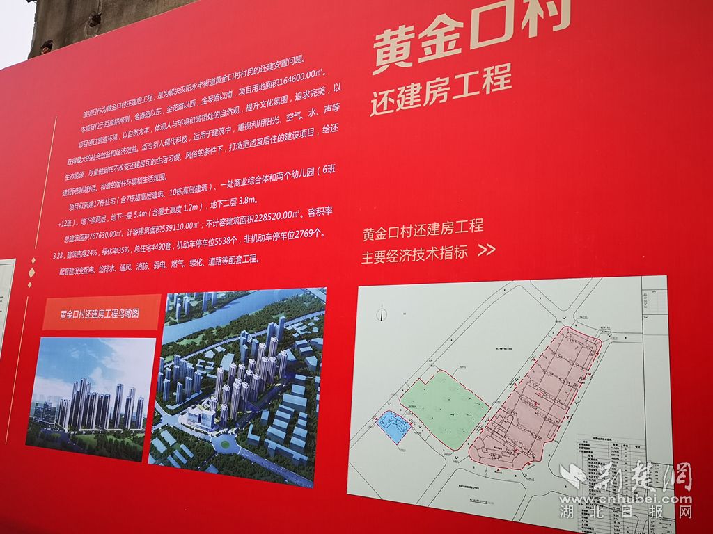 据汉阳区相关负责人介绍,黄金口村从2007年开展城中村综合改造,2009年全面完成了集体经济组织改制、户口改登、撤村建居、村改居人员参保等工作,并成立了武汉黄金口新城经贸集团有限公司。市、区各职能部门给予了该村极大关注和鼎力支持,凝心尽智帮助该村谋划发展。2018年底,黄金口正式启动了统征储备改造工作。两年来,黄金口人上下齐心,克难攻坚,举全村之力,完成了整村90%的拆迁任务。