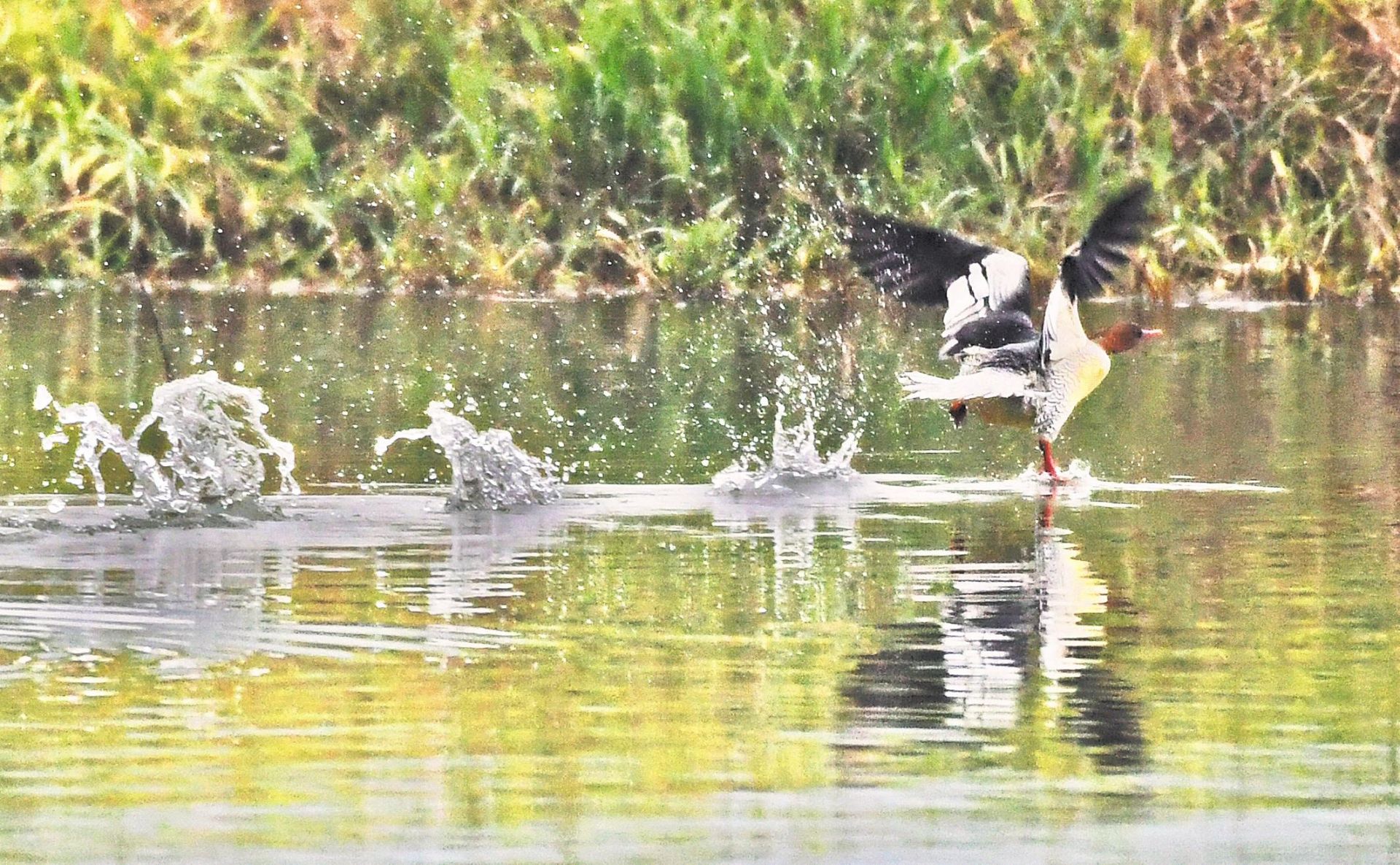 12月1日,当阳青龙湖国家湿地公园内,一群中华秋沙鸭在水面嬉戏,不时溅起阵阵水花。近年来,当地严格湿地保护,强化水质监测、植被恢复等,为野生动植物提供了良好的栖息地和繁殖场所。
