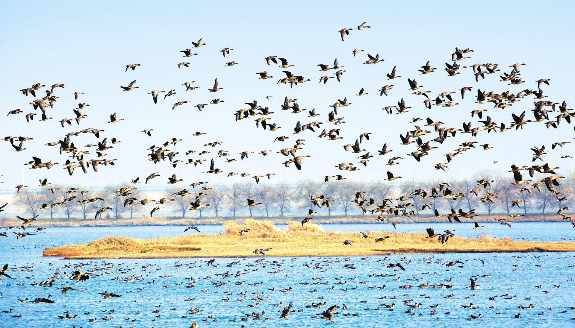 连日来,武汉市东西湖区柏泉府河湿地,上万只候鸟在水面上嬉水飞翔。入冬以来,白天鹅、卷羽鹈鹕等30多种国家重点保护鸟类陆续飞抵,让湿地变得热闹起来。近年来,相关部门对府河湿地非法盗猎、乱捕现象进行严厉打击,志愿者24小时值守,确保候鸟安全越冬。(视界网 郭贤乐 摄)