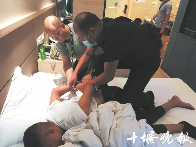 在宾饭床上,郭昕(左)和同事将嫌疑人抓获。