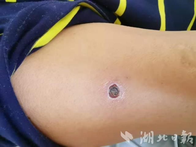 问题出在哪里呢?如果不快速锁定病因,可能危及患者生命。 在检查患者全身皮肤时,郭光云发现,他右上臂处有一个6到7毫米大小凹陷的深黑色痂。患者表示,从没察觉,因为不痛不痒。