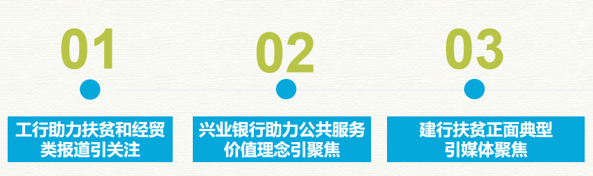 该阶段,新华社、中国新闻网、人民网、央广网、中国网、消费日报网等央媒,以及湖北日报、楚天都市报、荆楚网等省级媒体积极关注聚焦工商银行、兴业银行、建设银行等相关动态,内容主要涉及扶贫案例及典型、助力公共服务和地方经济发展等层面。