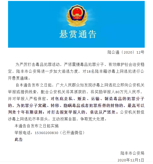 据广东省陆丰市公安局微信公众号消息,为严厉打击毒品犯罪活动,严惩震慑毒品犯罪分子,有效维护社会治安稳定,12月1日,陆丰市公安局进一步加大追逃力度,发布陆公通〔2020〕12号文,对18名陆丰籍涉毒上网逃犯进行公开悬赏通缉。