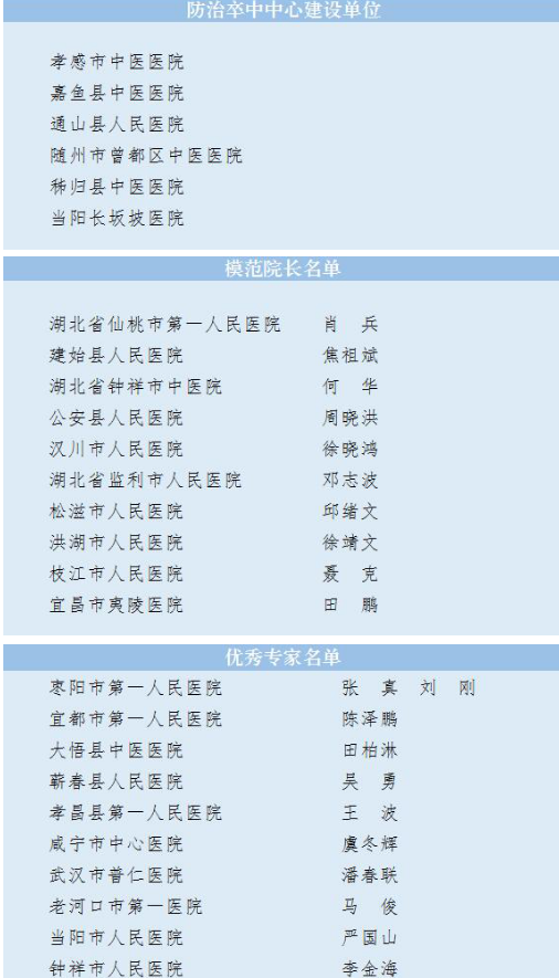 湖北省仙桃市第一人民医院院长肖兵等10位院长在2020年度湖北省脑卒中防治评优评先中获评“模范院长”,枣阳市第一人民医院张真、刘刚等11位专家获评“优秀专家”。