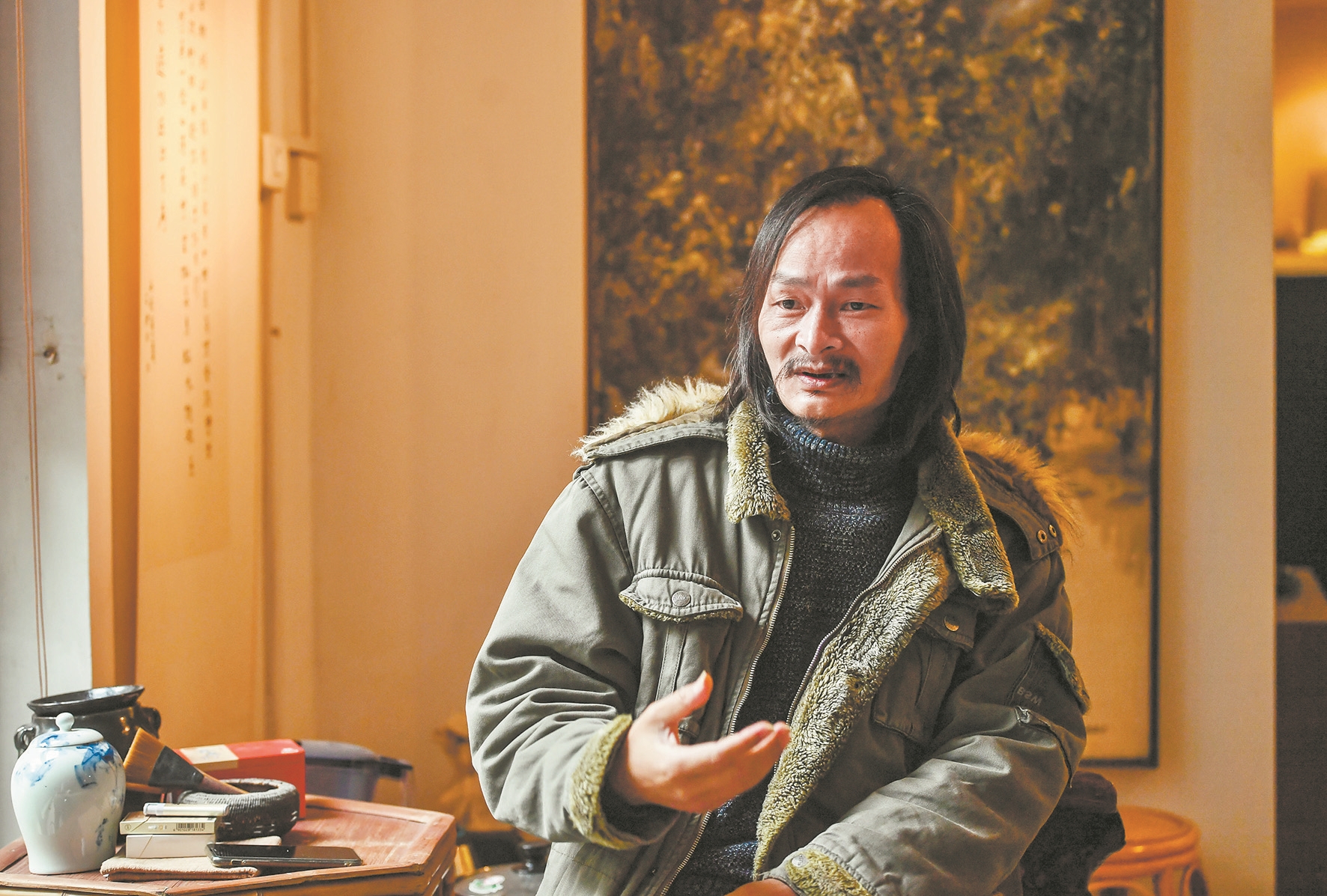 他确实是“搞艺术的”。李剑,字若水,号潜夫、半壁山人,湖北省国画院专业画家,湖北省书画研究会副主席。2005年,年仅29岁的画家李剑斩获首届中国写意画大展最高奖,从此成为湖北“70后”画家中的中坚力量。十余年来,山林飞鸟,孤石溪泉,都在李剑的笔下生出别样韵味,令观者沉迷。11月27日,李剑在个人画室里接受楚天都市报记者专访,而话题就从大家围坐的石制茶几说起。
