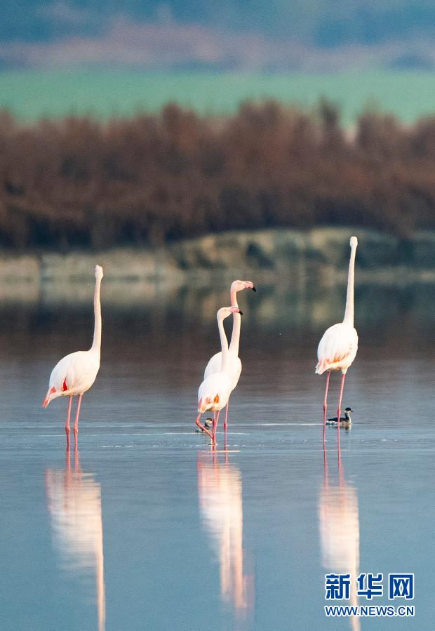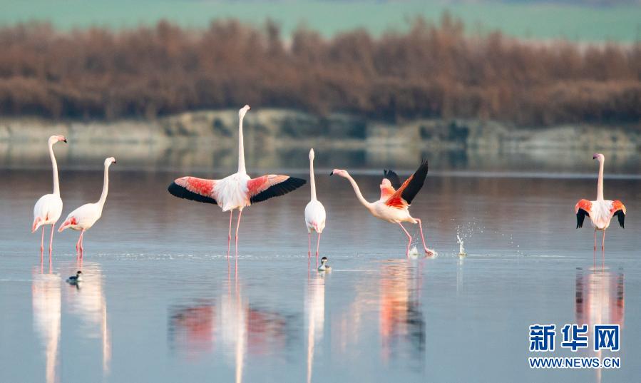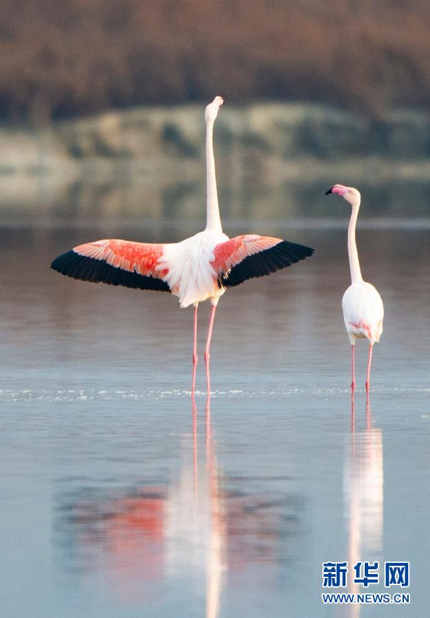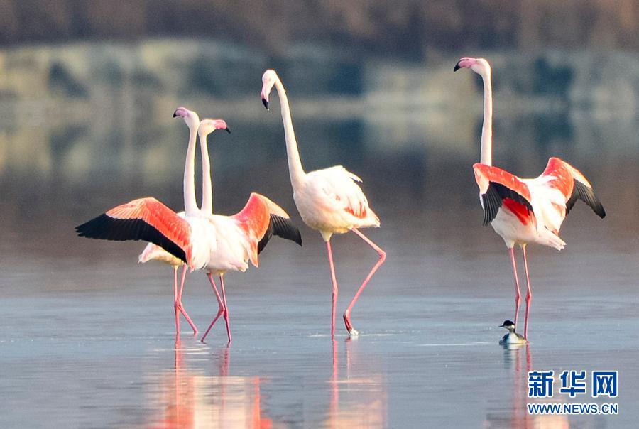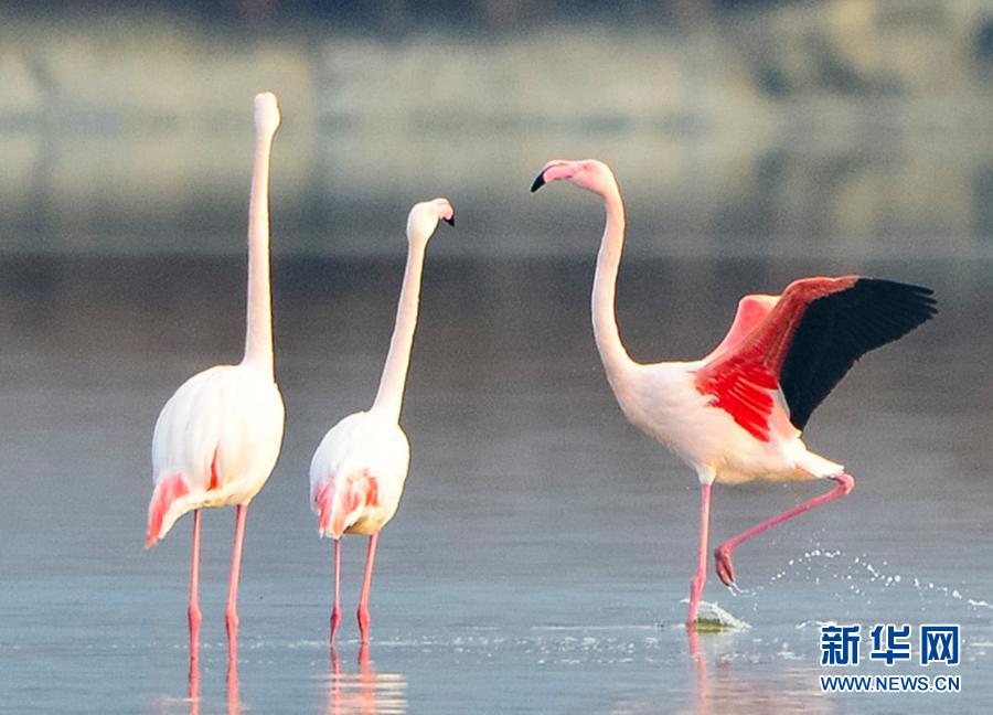 随着气温下降,一些火烈鸟飞抵山西运城盐湖,成为冬日盐湖一道美丽的风景。