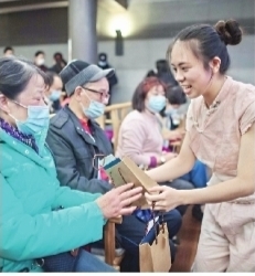 演员在表演结束后为现场观众赠送澳门特产。