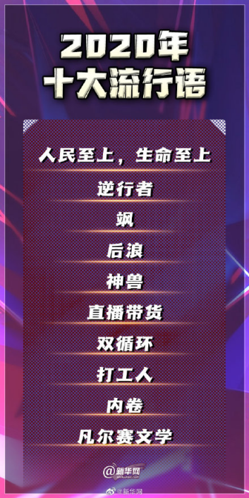 5、2020年十大流行语发布 4日,《咬文嚼字》发布了2020年十大流行语,分别是:“人民至上,生命至上”“逆行者”“飒”“后浪”“神兽”“直播带货”“双循环”“打工人”“内卷”“凡尔赛文学”。(@新华网)