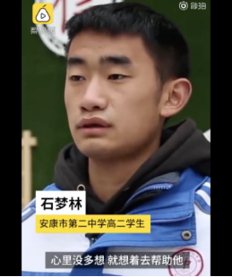 2、高中生狂追撞人逃逸三轮200米 陕西安康,一位老人被三轮车撞倒,司机逃逸,高二学生石梦林狂追200米。由于没追上肇事车,男孩将老人扶至路边,帮忙报警、联系家人,警方很快锁定了嫌疑人。男孩说,当时周围没什么人,如果自己不帮忙,担心老人伤势会加重。(@一手video)