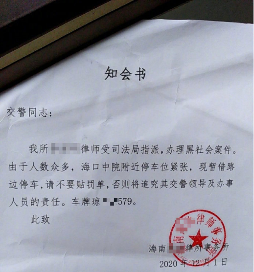 12月4日,海南交警发布了上述知会书照片,并表示“来了,老弟!法律面前人人平等,立即依法查处,海南交警已经在路上!”目前,该律师已经因违停被依法处罚。(澎湃新闻)