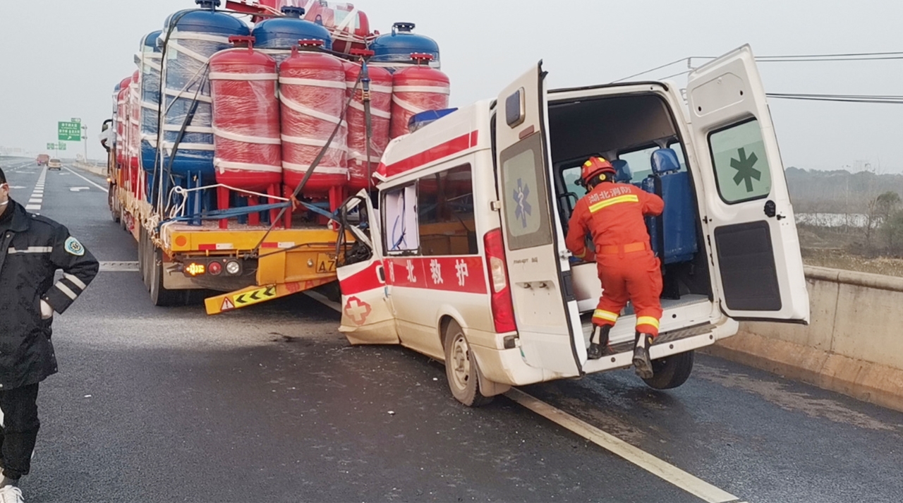 昨日上午6时许,在武汉市江夏区四环线往武昌方向距梁子湖大道约1公里处,一辆120救护车与挂车发生追尾,救护车撞上挂车尾部,驾驶室严重变形。武汉消防紧急调度纸坊消防救援站的救援人员赶赴现场施救。消防员赶到现场时,驾驶员仍被卡在驾驶室不能动弹,受伤严重,身上有明显血渍。事发地位于四环线,路过车辆较多,为避免发生二次事故,消防站指挥员迅速组织消防员配合现场交警设置警戒区域,另一组消防员携破拆工具实施救援。