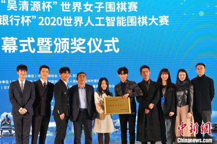 图为12月4日晚,嘉宾为获得2020世界人工智能围棋大赛总决赛冠军的星阵围棋代表(中)颁奖。当日,“福建海峡银行杯”2020世界人工智能围棋大赛颁奖仪式在福州举行。 记者 张斌 摄
