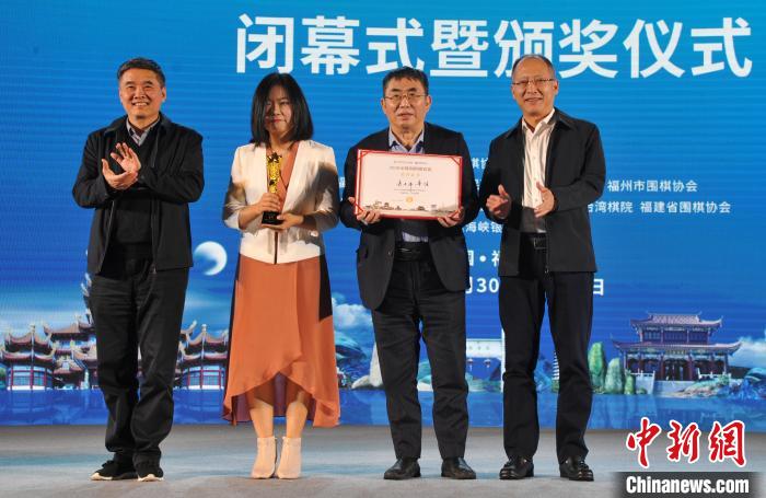 图为12月4日晚,嘉宾为获得冠军的师徒组合聂卫平(右二)、鲁佳(左二)颁奖。在福州举行的第三届“吴清源杯”世界女子围棋赛同期举行了2020亲缘围棋邀请赛,聂卫平、鲁佳(师徒)获得冠军。 记者 张斌 摄