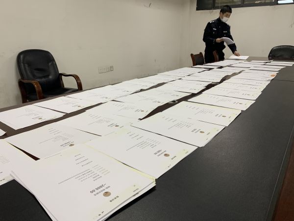 二七街派出所民警正在清理沈强(化名)的转账记录,共有数百页。 通讯员唐时杰 供图