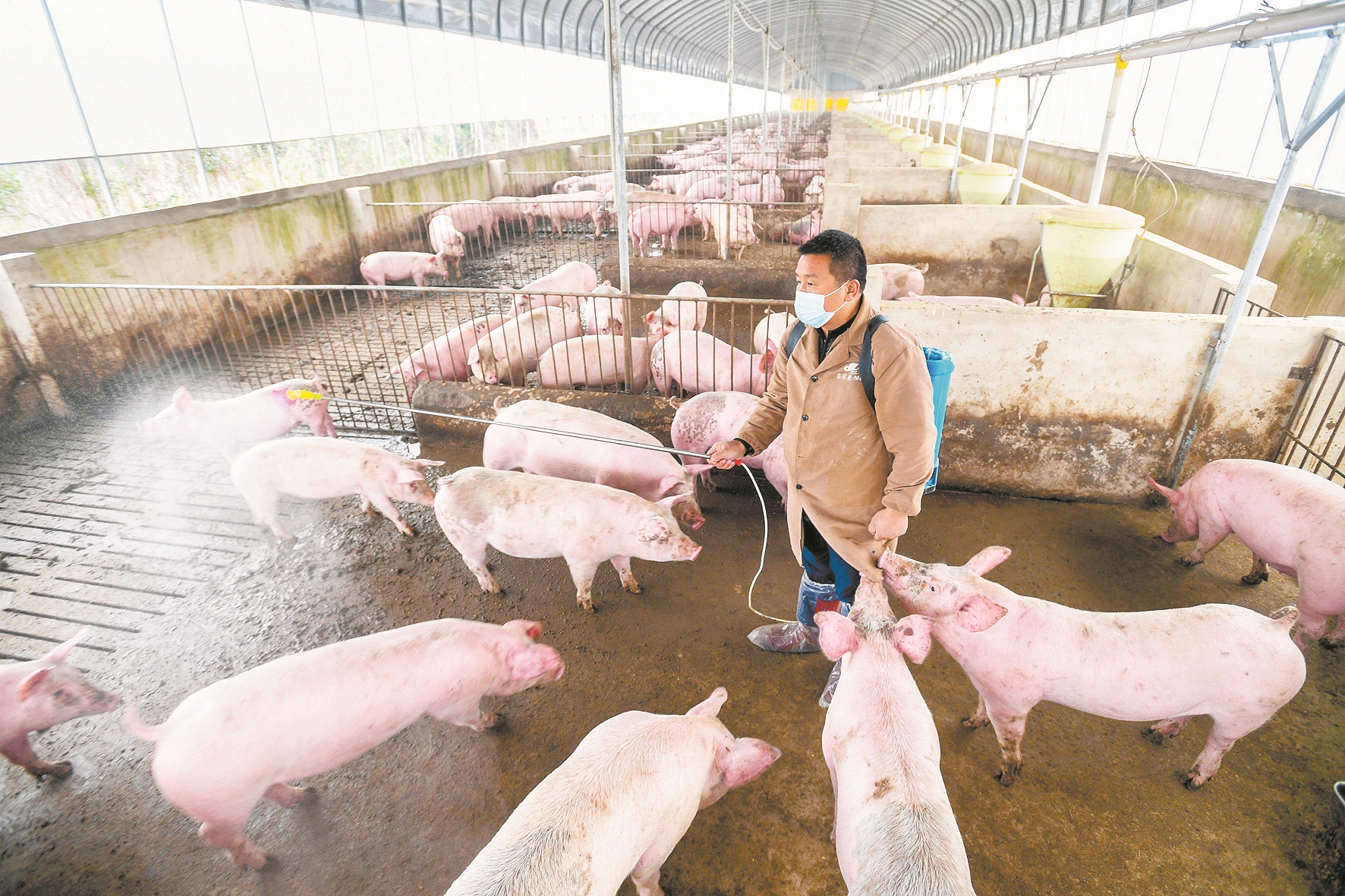 程林利对猪舍消毒把好防疫关