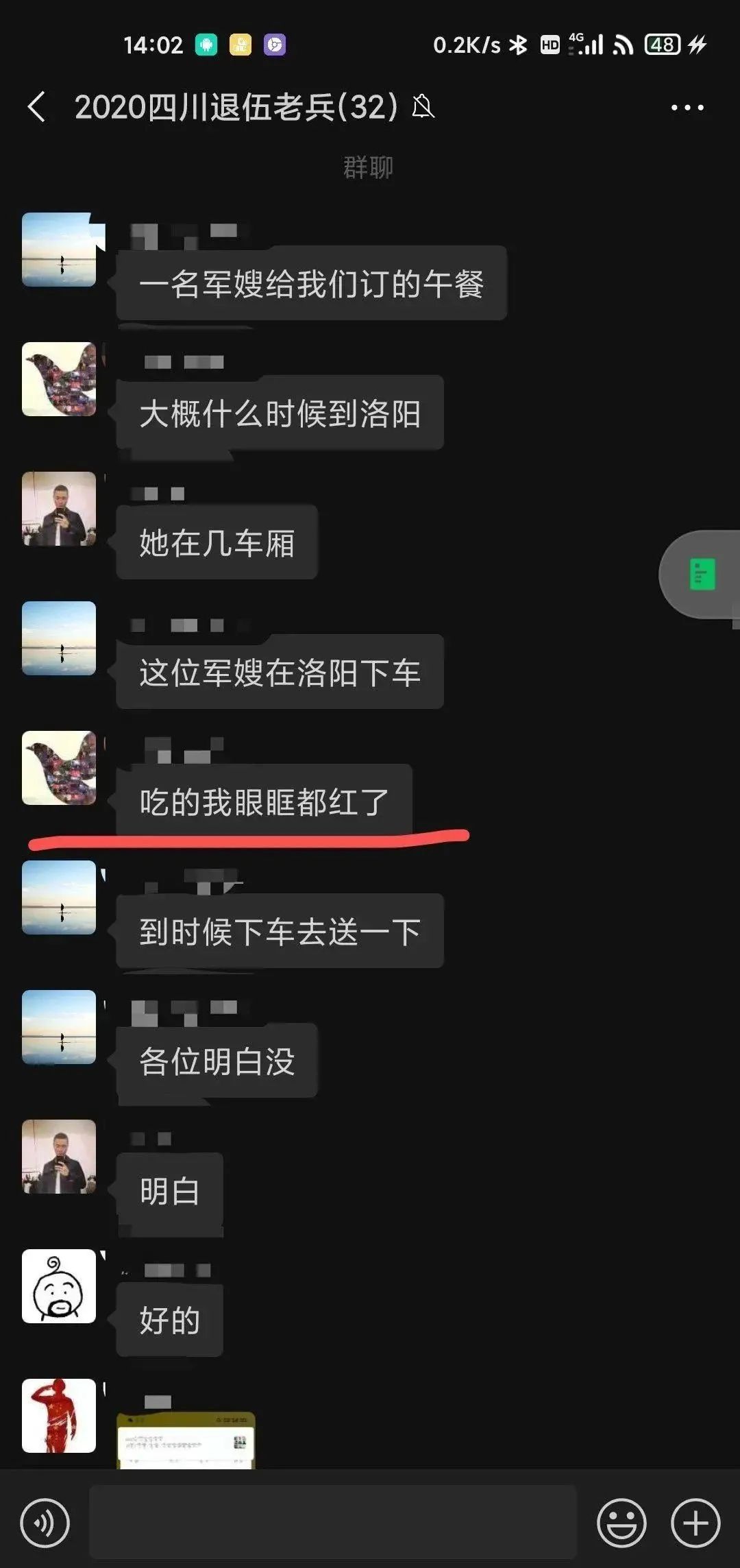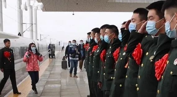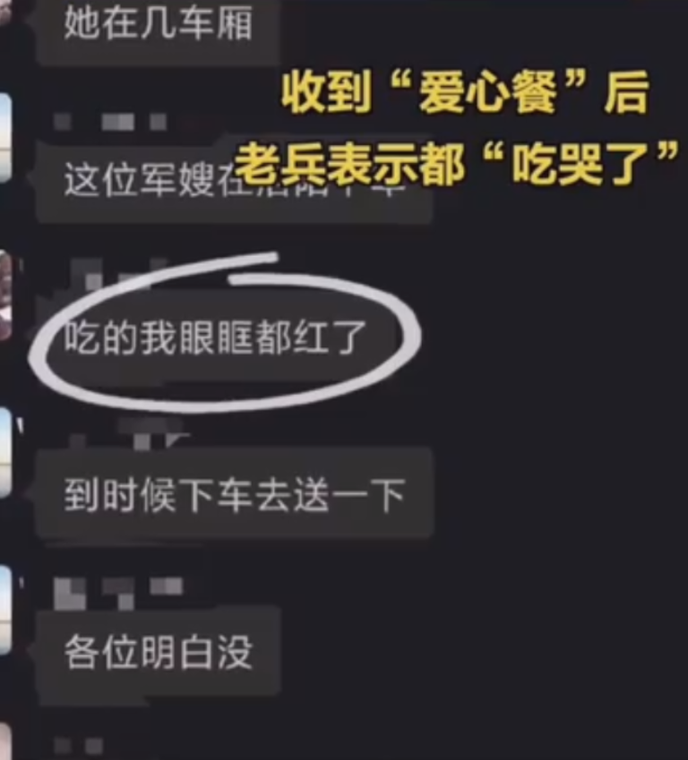 美好的时光总是短暂的,而美好的经历却足以永远留在心间。当得知闫冰在洛阳龙门站下车时,身边的老兵一再要求“能不能等一会再下车”。原来他把军嫂请大家吃饭的事发到了微信群,大家一致决定,要利用停站短短的4分钟,以军人特有崇高的方式向军嫂闫冰表示感谢和敬意!
