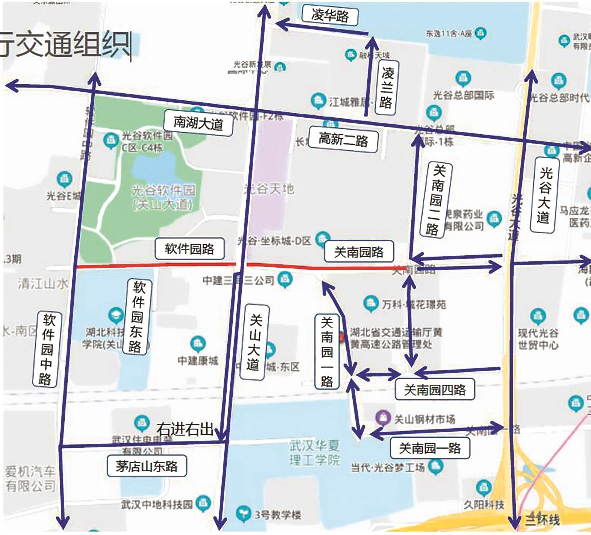 软件园路、关南园路虽然道路不长,却是东湖高新区内一条重要的东西向次干路,交通位置重要,两者是关山大道、光谷大道等主要骨架路网的集散道路,主要服务于周边的光谷软件园、光谷坐标城、中建康城、万科城花璟苑、湖北科技职业学院等。