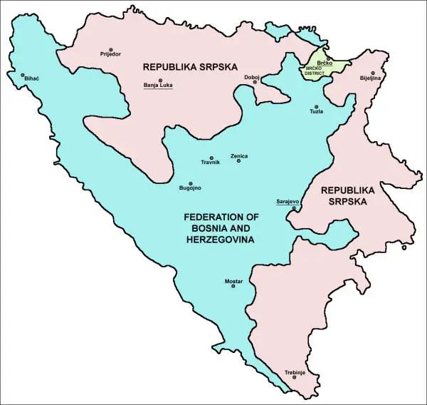 如今的波黑由波黑联邦(蓝色)和塞族共和国(黄色)组成,绿色是共同管理的布尔奇科区。图自维基百科