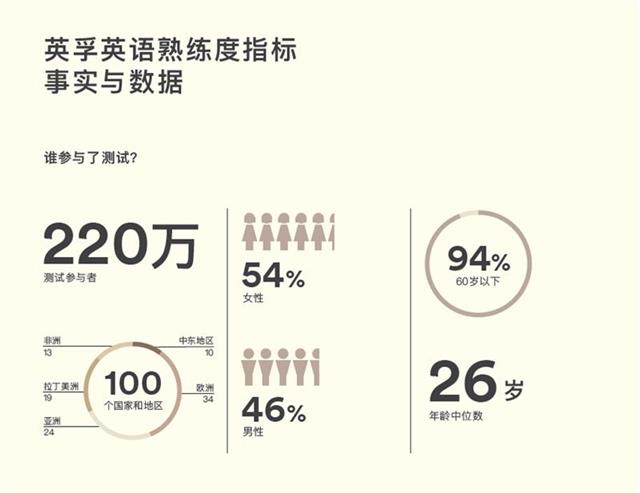 据介绍,“2020英孚英语熟练度指标报告”是根据2019年超过220万名接受英孚标准化英语测试(EFSET)的参试者数据统计得出,揭示了全球100个母语为非英语的国家和地区的成人英语水平。