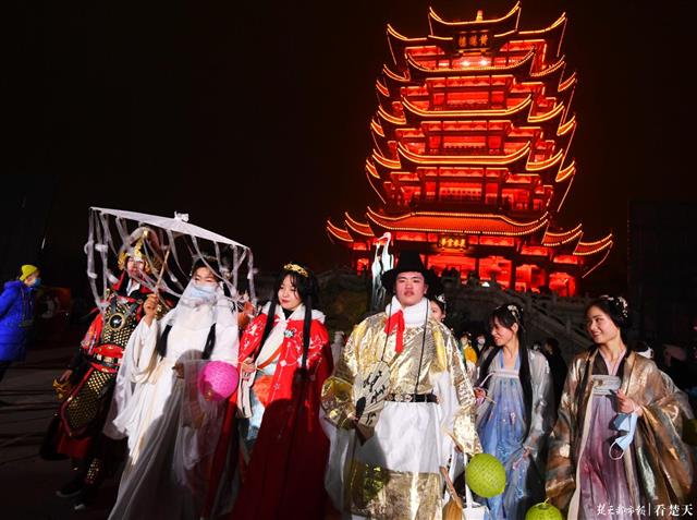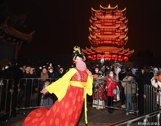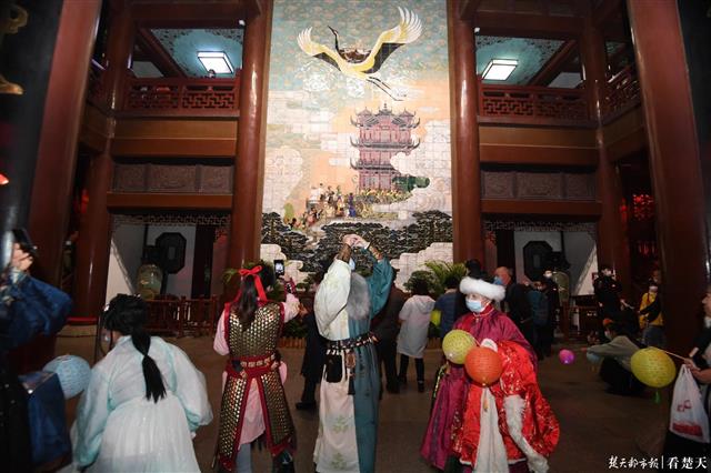登完主楼解锁完360°武汉城市夜景,来到中央广场,一阵“快看,这里也有不倒翁小姐姐”的惊呼声迅速在人群中引起骚动,原来这是《夜上黄鹤楼》汉服游园会的另一场重头戏。一位“不倒翁小姐姐”伴随着音乐翩翩起舞,与游客互动时笑容温柔,仿佛从画中穿越出来一般。游客们赏良辰美景,梦回千古大唐,盛唐服饰与黄鹤楼璀璨光影相映成趣,再现衣冠上国的华美盛世。