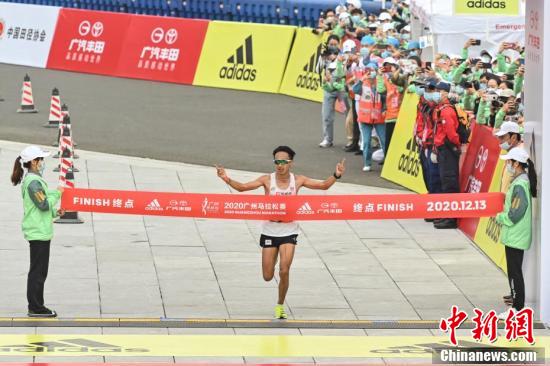 12月13日,2020广州马拉松赛在广州天河体育中心鸣枪开跑。图为男子组第一名贾俄仁加冲线瞬间。