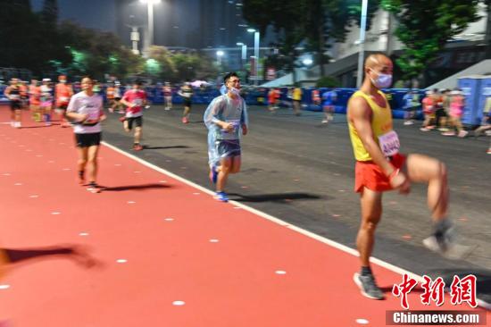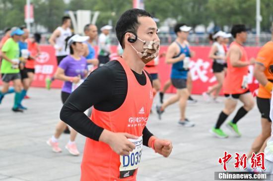 12月13日,2020广州马拉松赛在广州天河体育中心鸣枪开跑。图为一名跑者佩戴口罩参赛。