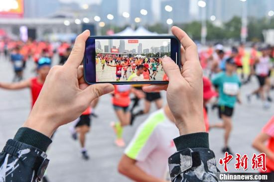 12月13日,2020广州马拉松赛在广州天河体育中心鸣枪开跑。图为一名观众用手机记录赛事。