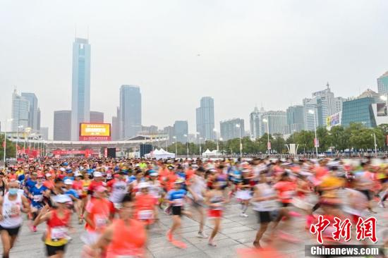 12月13日,2020广州马拉松赛在广州天河体育中心鸣枪开跑。