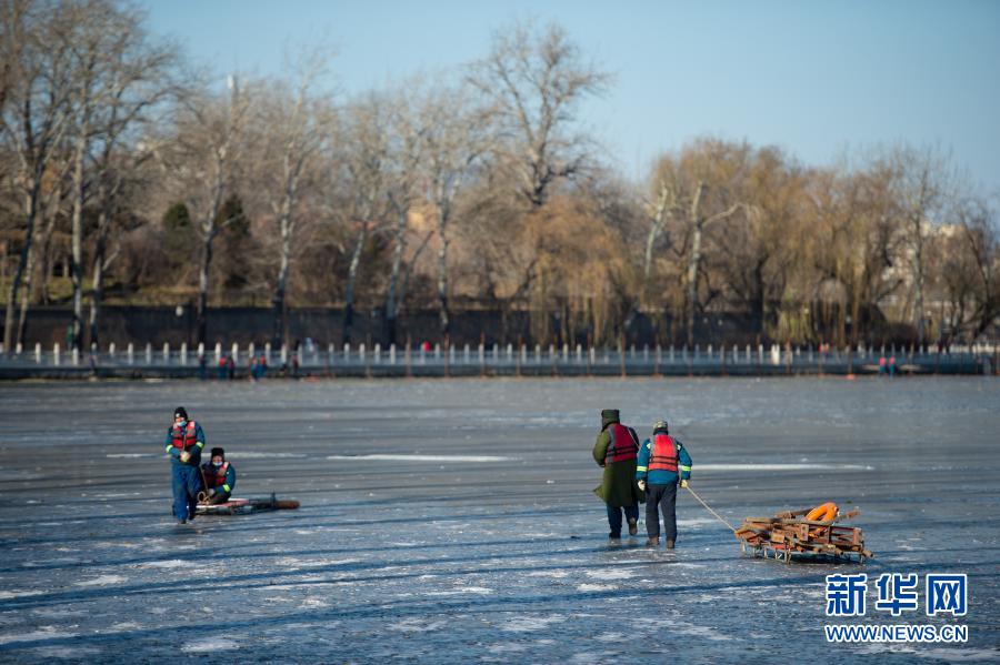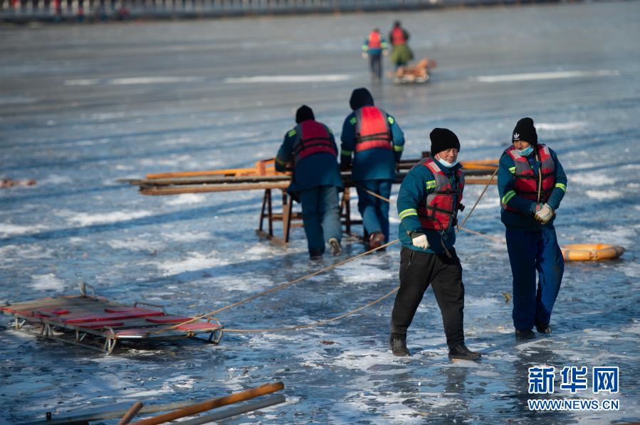 12月13日,工人在什刹海景区结冰湖面上忙着搭建围挡,以保证游人安全。新华社记者 陈钟昊 摄