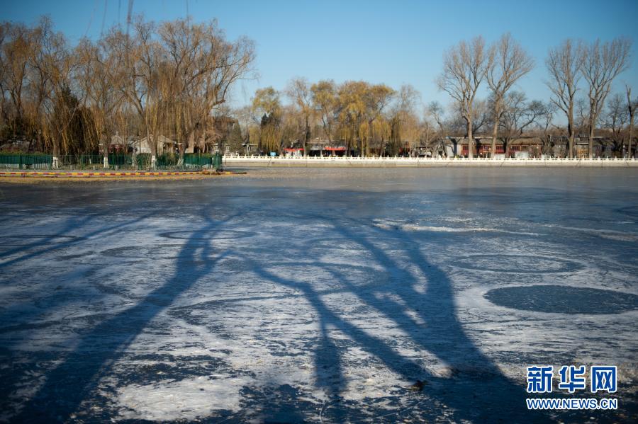 12月13日,阳光在什刹海景区结冰的湖面上照射出树的影子。新华社记者 陈钟昊 摄