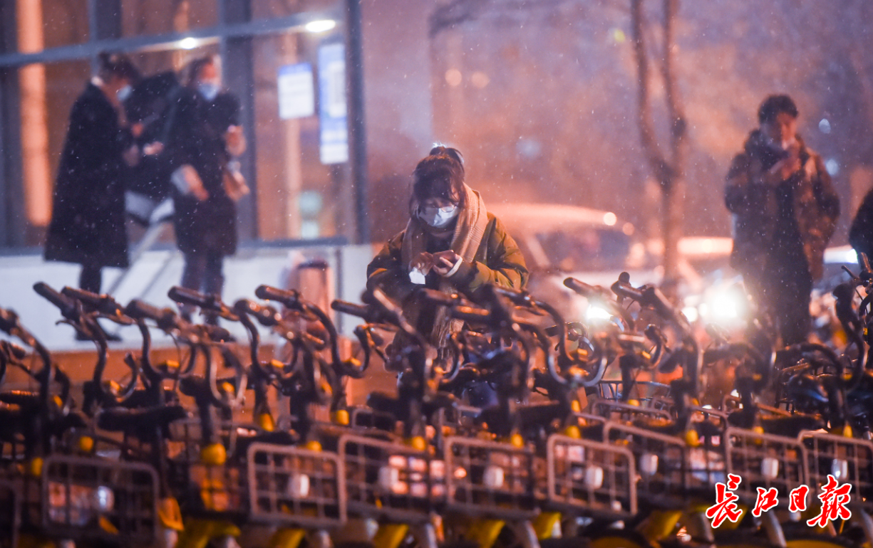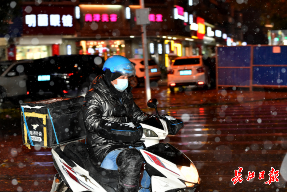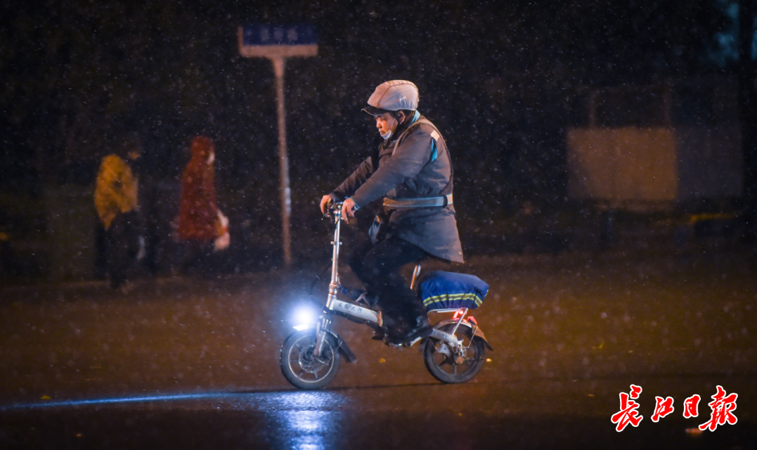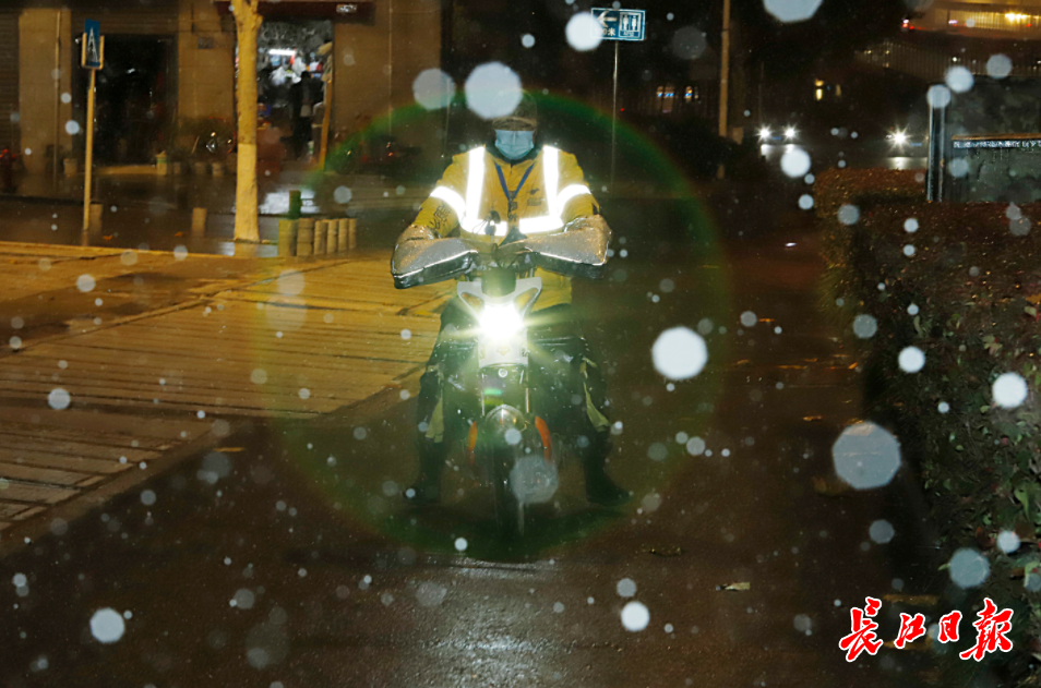 长江网12月13日讯12月13日晚,武汉气温骤降风力逐渐加大,初雪如约而至。雪夜里,依然有人奔波着,守护你我的生活。