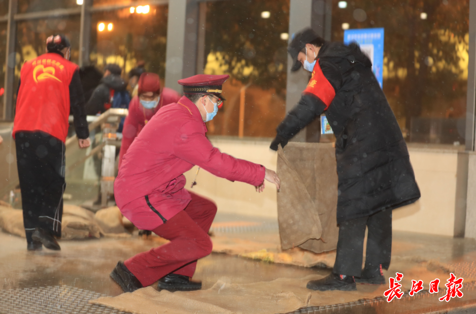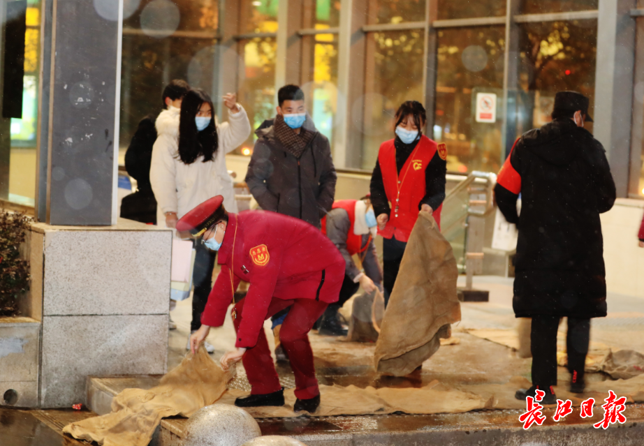 出租车在雪中穿行,路上时不时还能看见外卖员、代驾等熟悉的身影。楚河汉街地铁口,工作人员及时铺设防滑垫,确保市民安全进出地铁站。(记者何晓刚 詹松 杨涛 史伟 喻志勇 许魏巍摄影报道)
