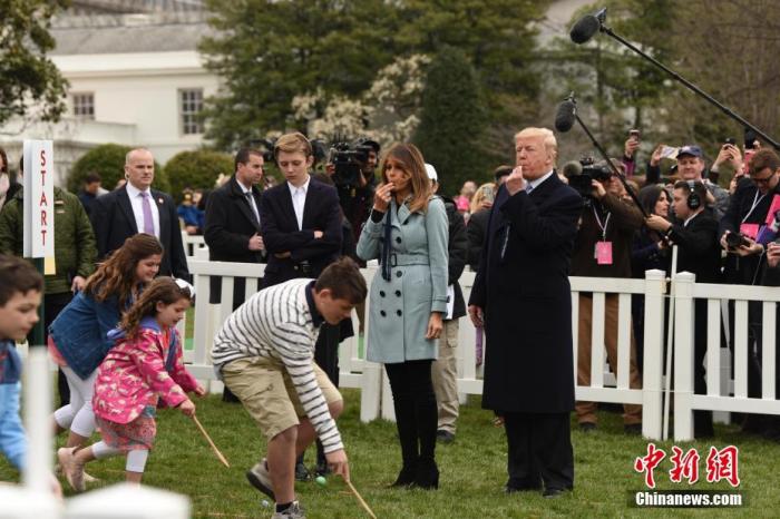 资料图:2018年4月2日,白宫举行一年一度的复活节滚彩蛋活动,特朗普携妻子、儿子等一同出席。中新社记者 刁海洋 摄