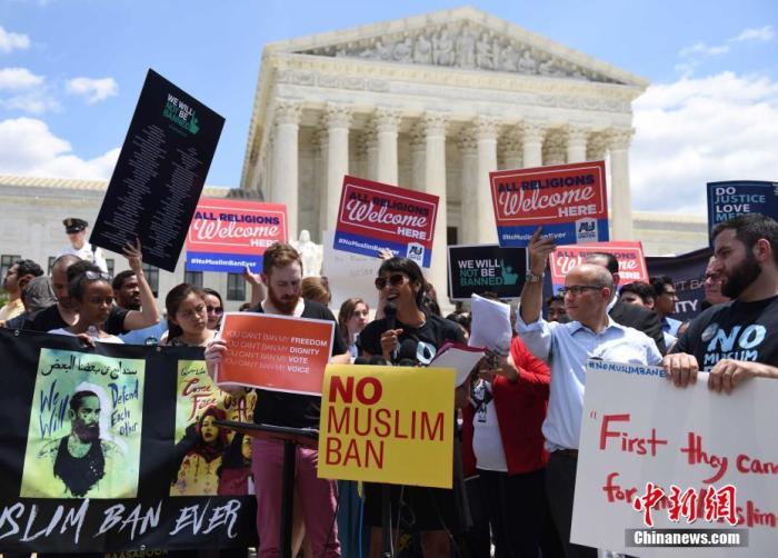 资料图:2018年6月26日,在联邦最高法院裁决,支持特朗普2017年颁布的移民限制令后,民众在最高法院门口抗议。中新社记者 邓敏 摄