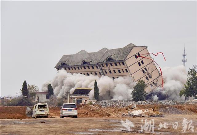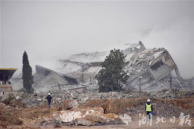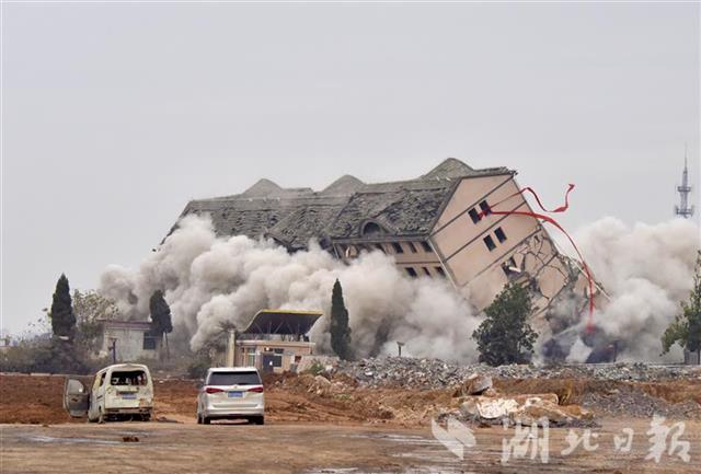 “这栋大楼拆除后,跑道建设就没有障碍了。”鄂州市临空经济区杨叶镇委书记余锦军介绍,今年8月份,企业的下料中心、堆场、生活区、办公区已拆除,作为机场跑滑区建设。鉴于综合大楼人工拆除难度比较大,也存在安全隐患,政府便通过招标引进武汉爆破公司进行爆破。