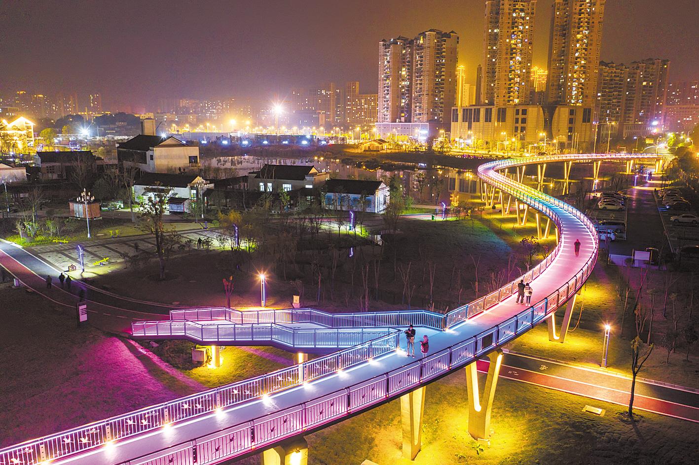 12月17日,黄石磁湖湿地公园内的人行观光桥,宛如黑夜中点亮的“彩虹桥”。全长463米的磁湖湿地公园人行观光桥,嵌入式安装1600余套LED灯带,实现“见光不见灯”的绚丽,并根据需要变化3种亮化灯光效果,展现不同风格场景。每当夜幕降临,观光桥瞬间变身七彩绚丽的“虹桥”,成为集休憩观景、文化娱乐于一身的城市新景观,吸引市民游客前往游览观赏。 (湖北日报全媒记者 薛婷 通讯员 周巍 摄)