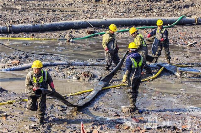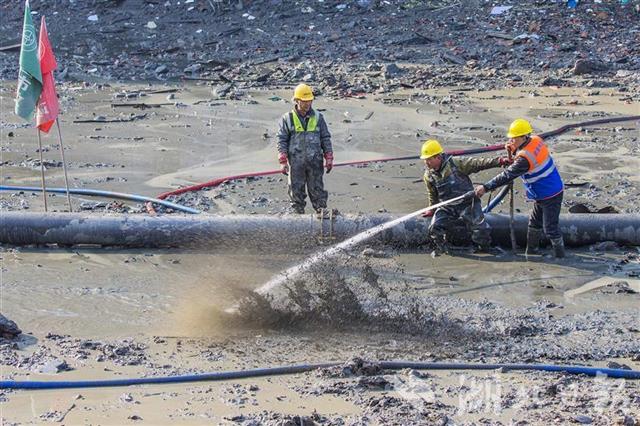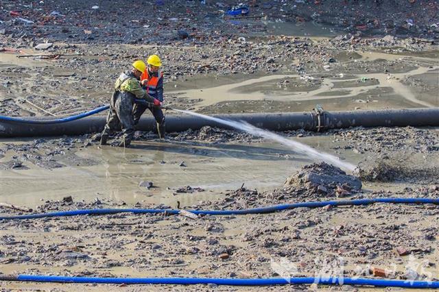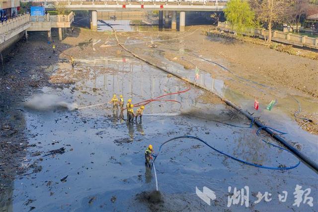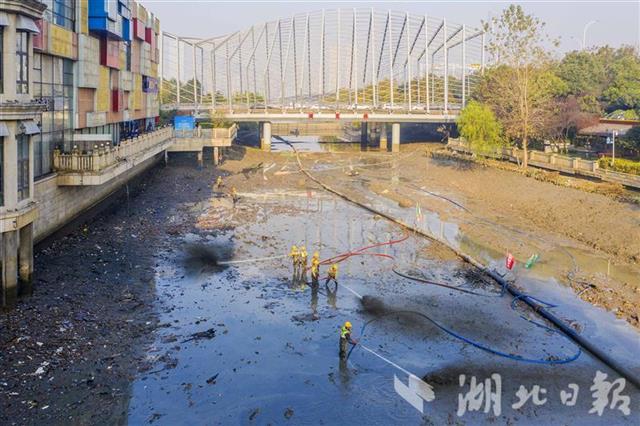 12月21日,武汉市武昌区连通外沙湖和水果湖的人工河——楚河,截流抽排河水后,正在进行河底清淤施工。本次主要对楚河进行河道清淤、岸线清杂、沿线排口生态化改造、水生态修复等工作。