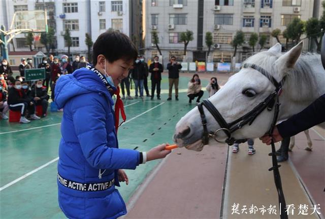 来自武汉商学院国际马术学院讲师们,为学生们详细介绍了关于马的知识和文化,而被点到回答问题的幸运孩子,还通过给马喂胡萝卜,近距离感受马儿的风采。