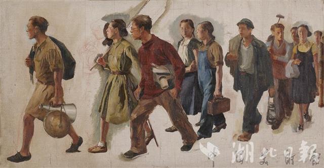 唐一禾作品《七七的号角》(画稿)是1940年为创作巨幅油画而制成的草图,表现一支由青年学生组织的宣传队奔赴城乡进行抗日宣传的情景。尽管因教学的繁重和生活的不安稳,此画没有最终完成,但就遗存的草图来看,画中人物既有个性特征,又揭示出那个时代热血青年的共同气质,队列的行进感和朴实无华的暖色调很好地表现了这一主题,极有号召力。