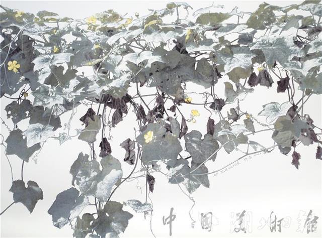 一堆枯萎的叶子中还盛开着花朵,植物世界的这一过程让人思考生命的规律和价值。湖北美术学院院长许奋的版画作品《花开的时候》通过8个印版的绘制并进行叠加套版印刷完成,采用了油墨、纸本材料。具象而细腻的平板绘制,表现出人们熟悉的对象。