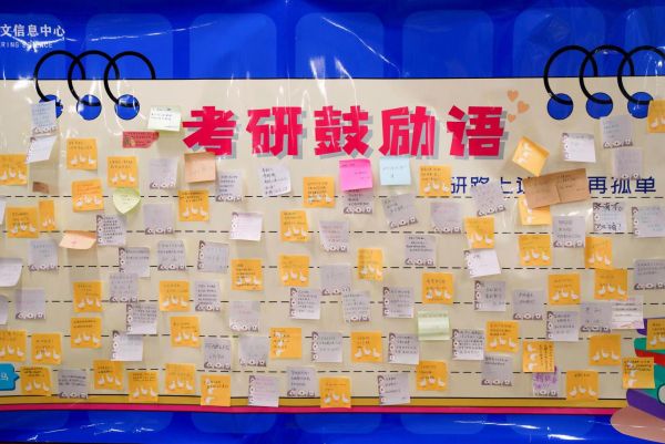 为考研学子保驾护航的还有学校各楼栋的宿管阿姨。为了鼓励这些学子,他们在一楼的公告牌上写满了祝福话语,希望他们考研顺利。“快要考试了,孩子们晚上学习到很晚才回来,我就把门留着等他们回来。”在学校已工作七年的宿管员刘正枝说。