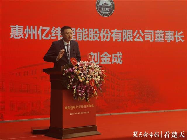 刘金成对武大感情深厚,连续多年在化学院设立“亿纬化学电源奖”,资助立志化学、品学兼优的学生。2015年,了解到学院科研用房十分紧缺,他再次慷慨解囊,捐资1000万元指定用于电化楼建设改造。