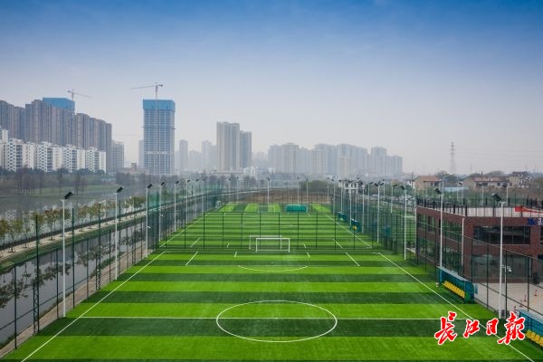 23日上午,长江日报记者来到汉阳墨水湖北路和玉龙路交会处,今年新建的玉龙路足球中心就在这里,坐落于龙阳湖东北畔,一片片崭新的人工草皮十分醒目,环境优美。