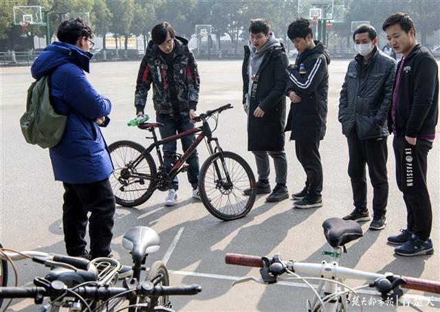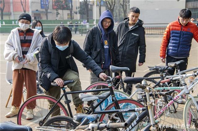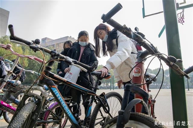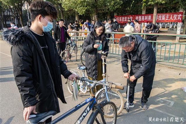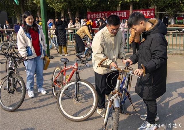 12月24日,湖北武汉,一高校后勤物业部门将清理出来的上百辆无人认领的自行车摆放操场,开展“自行车变废为宝、资源再利用,寻找新主人”活动,学生看准了自行车,只要登记就可以免费取走使用。当日,78辆无主自行车找到了新主人。