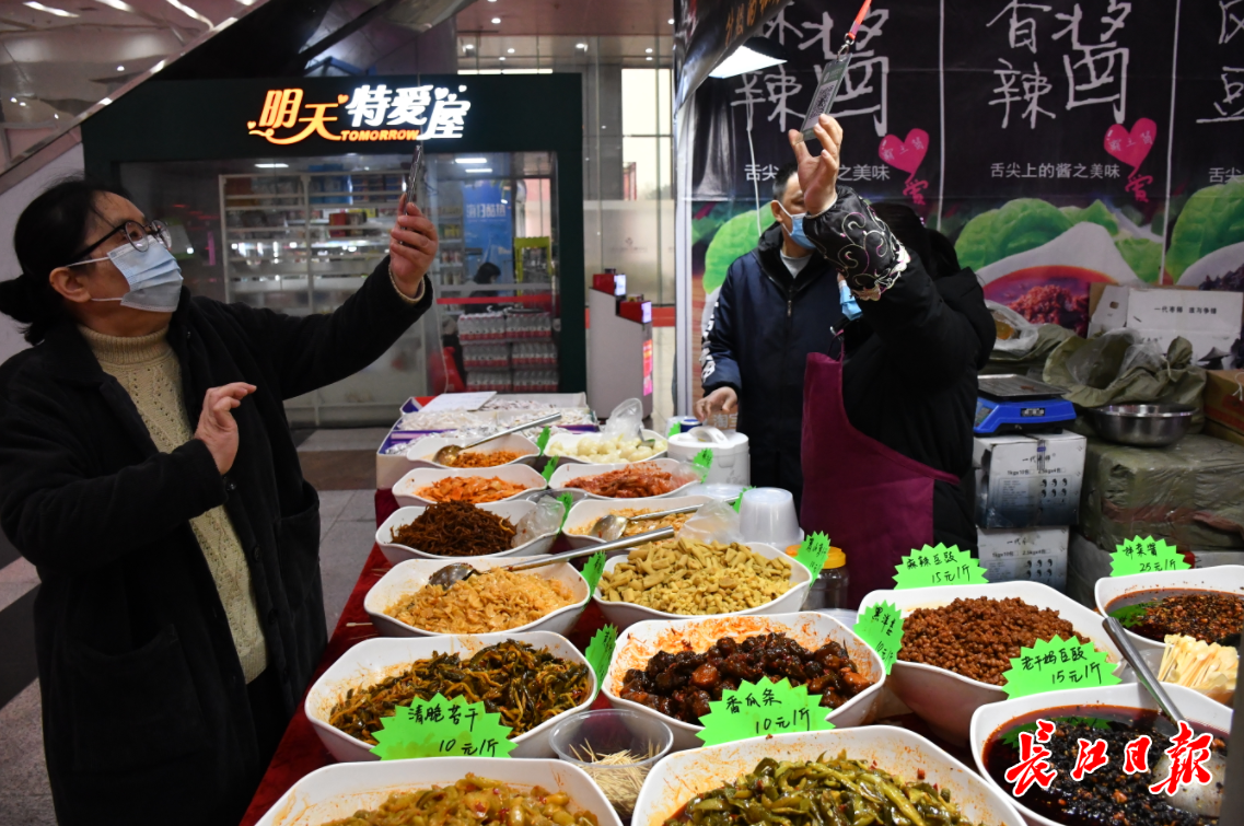 长江网12月26日讯12月26日,在武汉国际展览中心举办的荆楚情山货节上,房县花菇、山东酱猪肘、云南腊肉等各地农副产品相继亮相。吸引了众多市民前来购买淘货。(记者詹松 摄影报道)