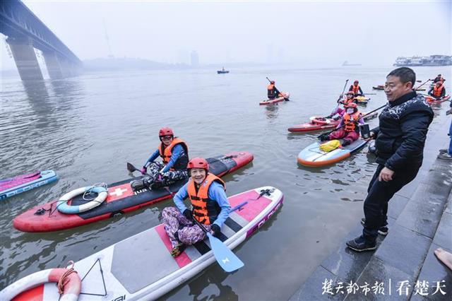 武汉桨板运动爱好者为冬泳爱好者保驾护航